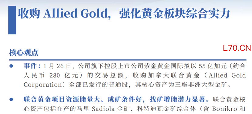 银河证券针对此次收购点评认为,联合黄金旗下项目均为在产或即将投产的大型露天开采金矿,本次收购将推动紫金矿业矿产金产量大幅增长,助力实现2026年105吨产量目标;同时快速补强公司非洲黄金板块布局,有效强化公司在非洲的资源联动体系。