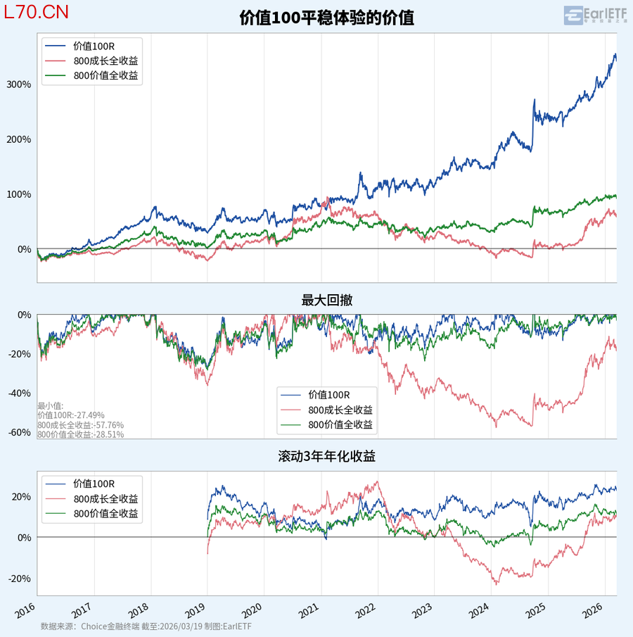 下图依然是价值100指数与800成长、800价值的对比,不过叠加了最大回撤与滚动三年年化收益,这两张副图或许会带给你迥异的观感。