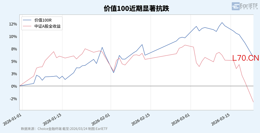 从下图可以看到,价值100指数近期相较中证A股显著抗跌,这显然离不开“挥别”有色金属的功劳。