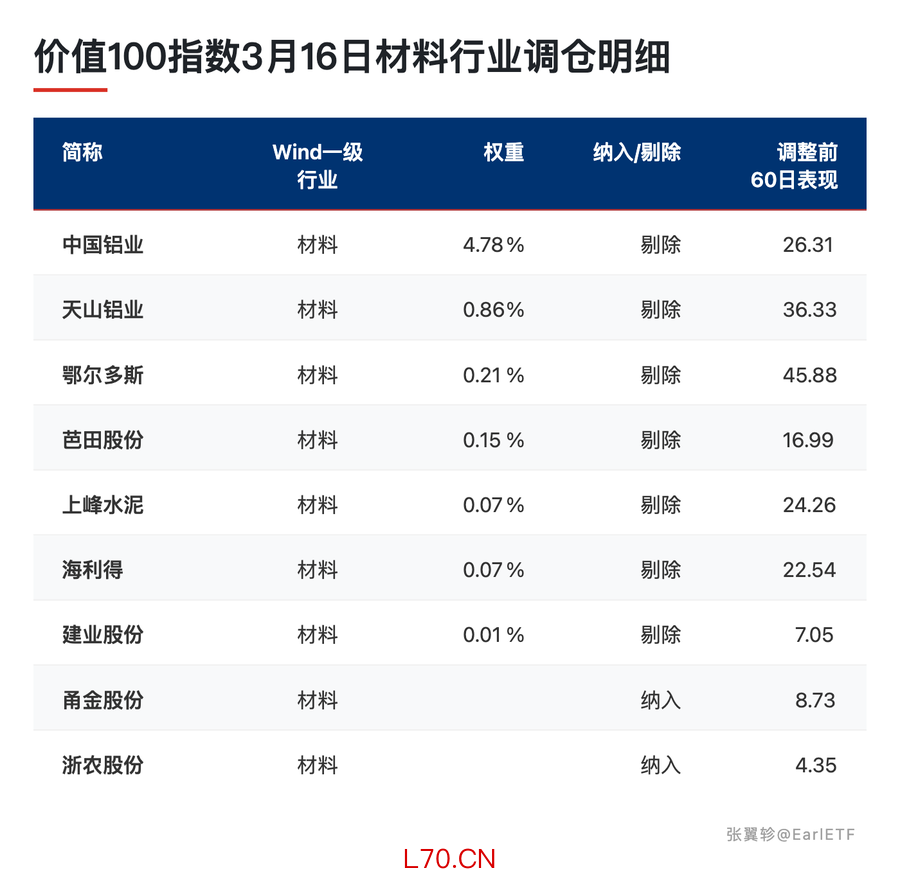 在3月16日生效的季度调仓中,价值100指数,剔除了7只材料行业成份股,调入两只。