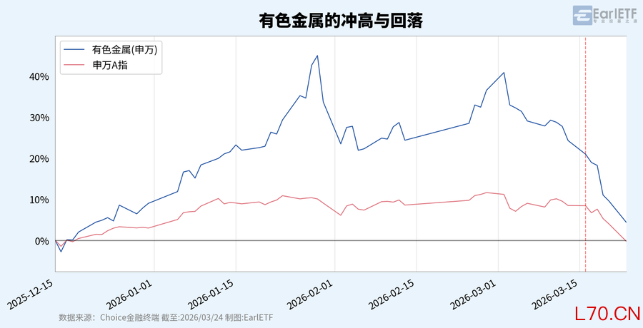 截至3月23日,黄金股从高点回撤37.59%,有色金属回撤31.34%。在牛市里体验熊市级别的回撤——这就是追着最热闹的概念跑的代价。