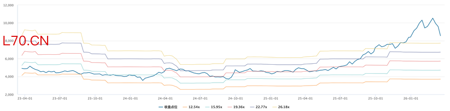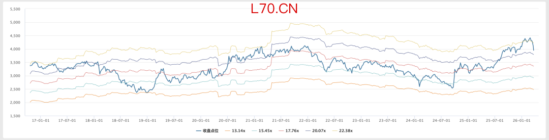 但在同一张图上,我们也看到了,指数从去年中位于中间区域,也就是19倍市盈率,一路飙升,2026年2月末最高时到了35倍。