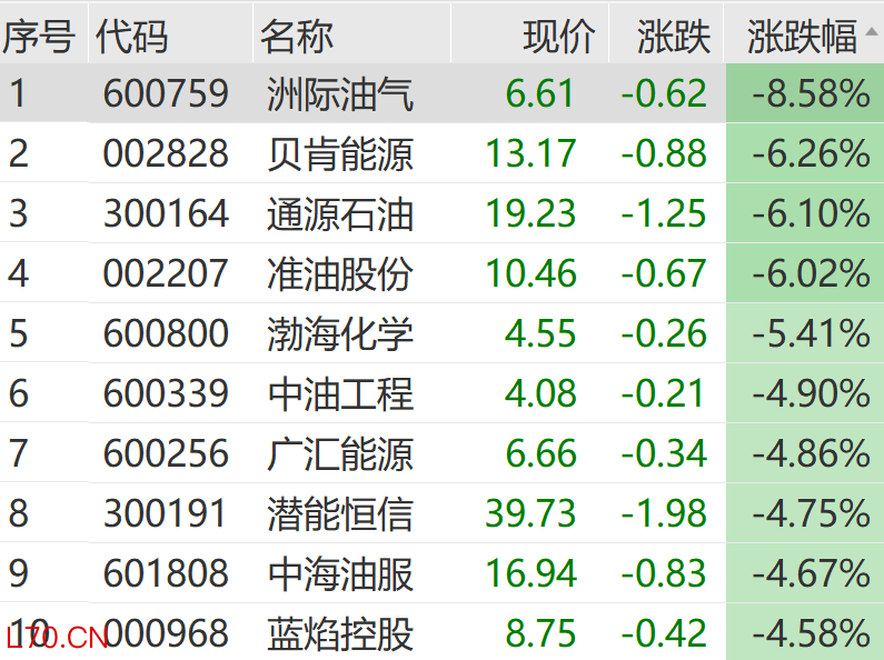A股石油石化板块同步走低,洲际油气跌超8%,贝肯能源、通源石油、准油股份等多股大跌。