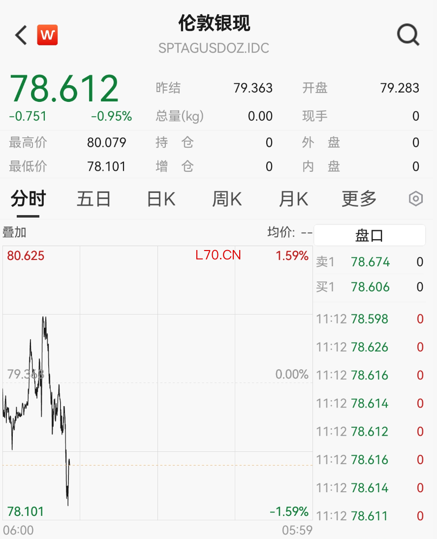 黄金、白银同步走低,现货白银价格一度跌至78美元/盎司附近。