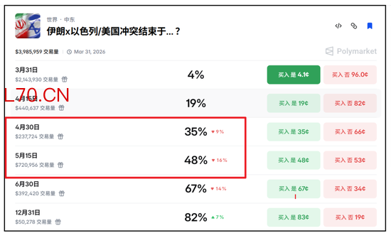 其三,从polymarket来看,认为能在5月底前结束的押注,也已经跌破50%了。