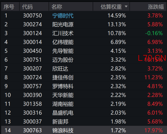 ETF里,涨得最猛的,恰是创业板新能源ETF华夏(159368),一度飙涨超过6%,重仓股里,10cm的猛将如云。