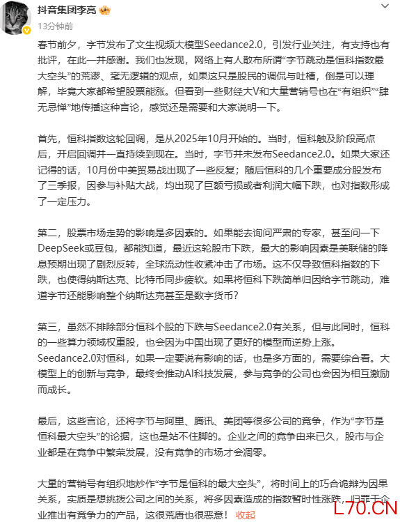 抖音集团李亮:炒作“字节是恒科的最大空头”很荒唐也很恶意