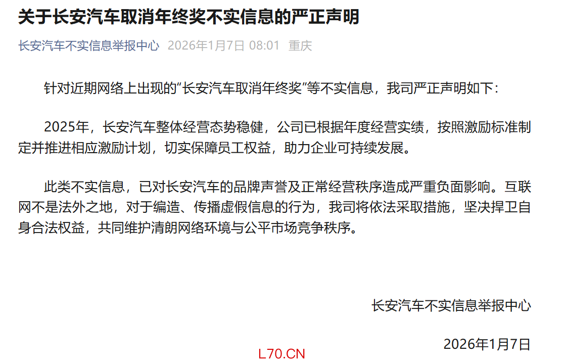 长安汽车:网传“取消年终奖”信息不实 已推进激励计划保障员工权益内盘外盘