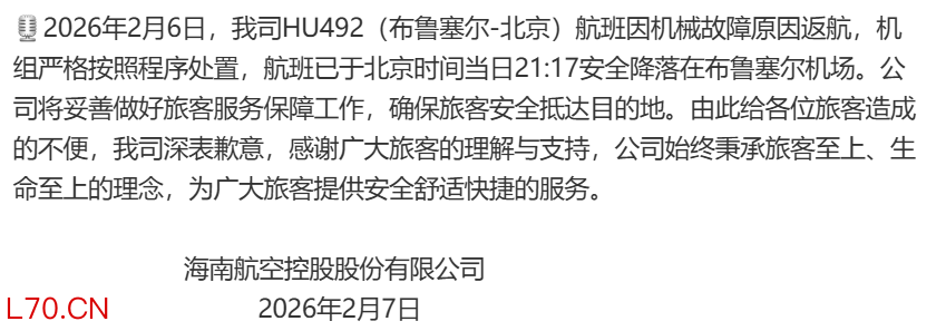 海航就HU492航班因机械故障原因返航致歉