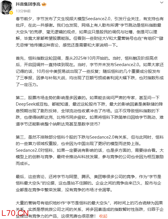 抖音集团李亮:炒作“字节是恒科的最大空头”很荒唐也很恶意