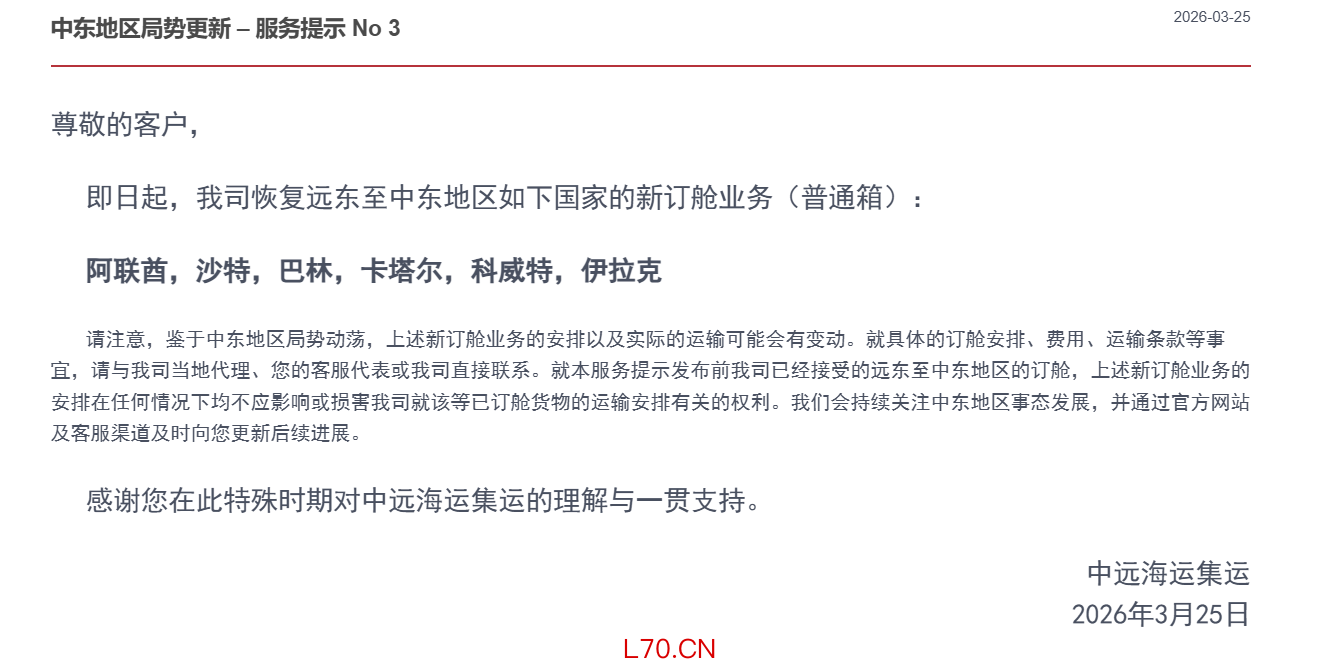 中远海运集运:即日起恢复至阿联酋,沙特,巴林,卡塔尔,科威特,伊拉克的新订舱业务