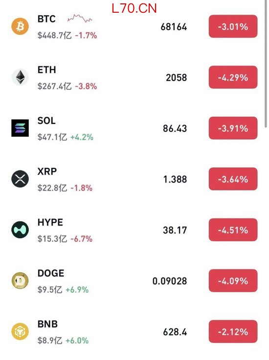 截至发稿,加密货币主要币种集体重挫,比特币跌超3%,跌至68100美元附近,以太坊跌超4%。