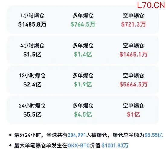 CoinGlass数据显示,最近24小时,全球有超20万人被爆仓 ,爆仓总金额为5.55亿美元。