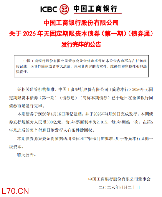 工商银行:2026年无固定期限资本债券(第一期)(债券通)发行完毕 发行规模300亿元
