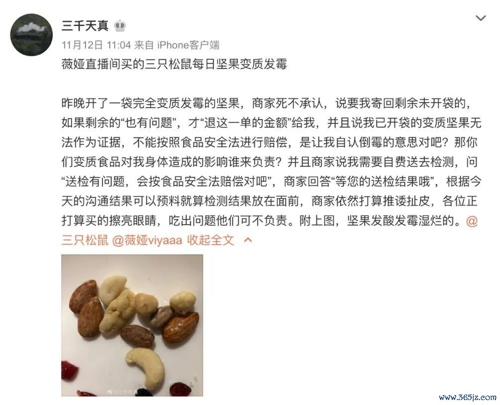 2021年11月12日,一位名叫“三千天真”网友发微博称,自己“双十一”期间,在薇娅直播间购买的三只松鼠(300783,股吧)产品出现了质量问题,并对三只松鼠不负责任的售后处理,表达了严重的不满。