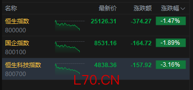 港股三大指数持续下挫,恒生科技指数跌超3%,阿里巴巴跌超7%