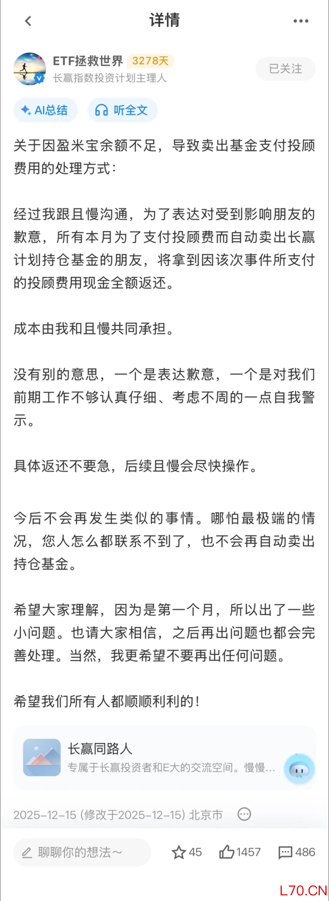 根据投资者提供的截图内容,此前2025年12月,针对“因盈米宝余额不足,导致卖出基金支付投顾费用的处理方式”,长赢指数投资计划主理人“ETF拯救世界”发表了一篇文章。文章称,“所有本月为了支付投顾费而自动卖出长赢计划持仓基金的朋友,将拿到因该次事件所支付的投顾费用现金全额返还”,并表示“今后不会再发生类似的事情。哪怕最极端的情况,也不会再自动卖持仓基金。”